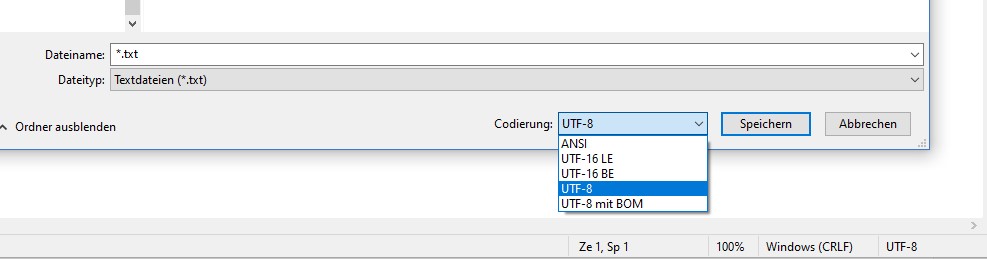 Nachdem ich mir Notepad++ installiert habe, konnte ich im UTF -8 Stil speichern