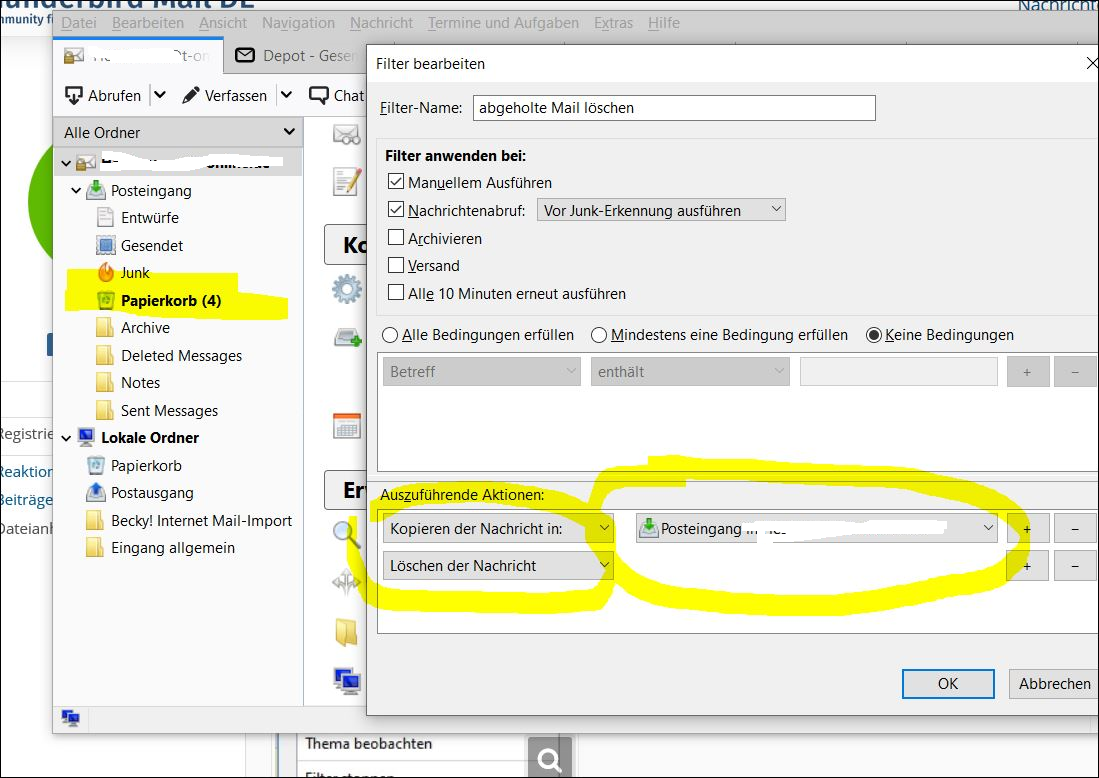 Dafür habe ich mir einen Filter erstellt (siehe Bild), trotzdem landen alle Mails sofort in den Papierkorb und keine in den Ordner Posteingang.
