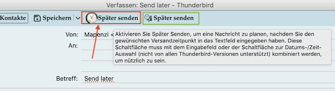 Die Später senden-Schaltfläche schiebt immer in den Postausgang, als ob Später senden nicht installiert wäre. Er ist aber installiert und funktioniert einwandfrei (wenn man es über das Senden Menü auswählt).