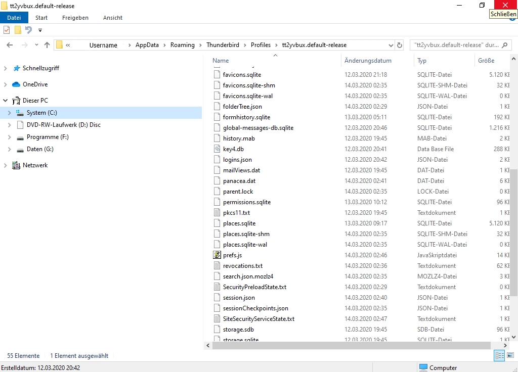 Die zweite Anomalie des verwaisten Profilordners 1jpv7npm.default-release ist die, dass er nur etwa die Hälfte aller standardmäßig erstellten Dateien enthält, wofür ich ebenfalls keine Erklärung habe.