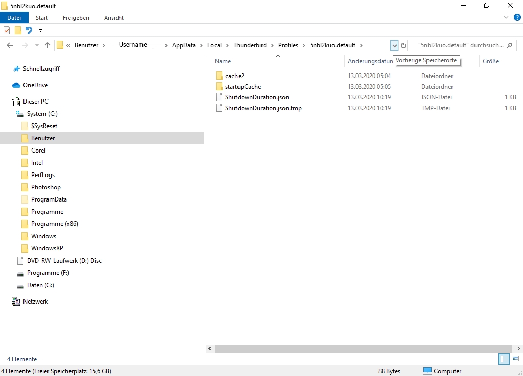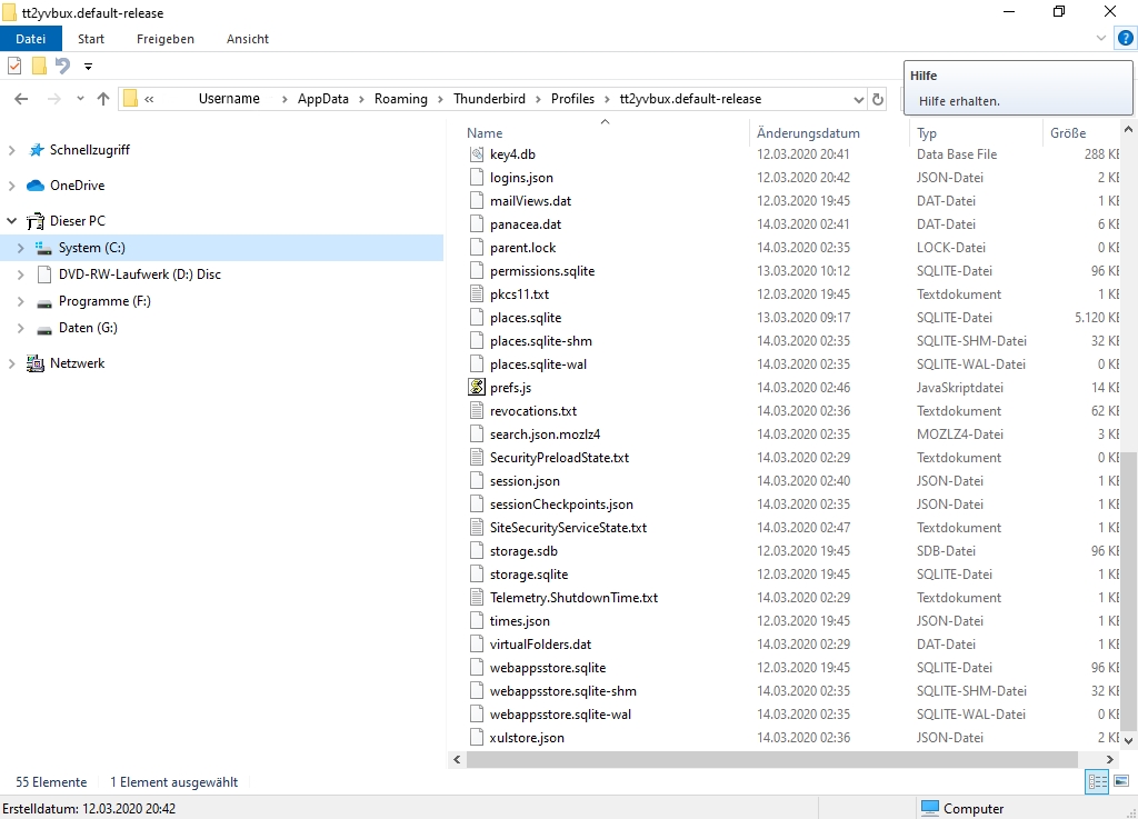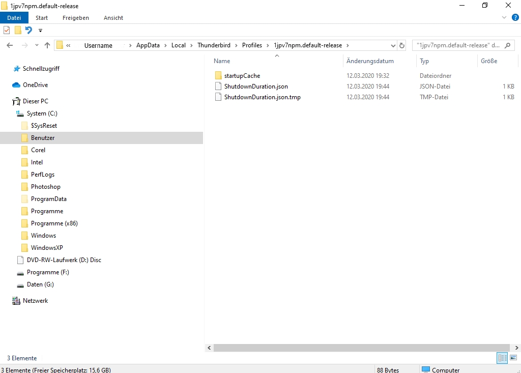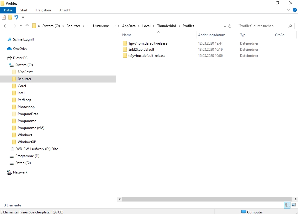 Vielleicht hat ein Windows-Spezialist noch Ideen, wie man eine Suche nach einer typischen Datei der Thunderbird-Profilordner durchführen könnte, so wie ich es schon vorgeschlagen hatte mit der Datei logins.json. Inzwischen habe ich gesehen, dass der Profilordner 1jpv7npm.default-release gar keine Datei logins.json enthält, also konnte man diesen Ordner auch nicht über eine Suche nach dieser Datei finden.