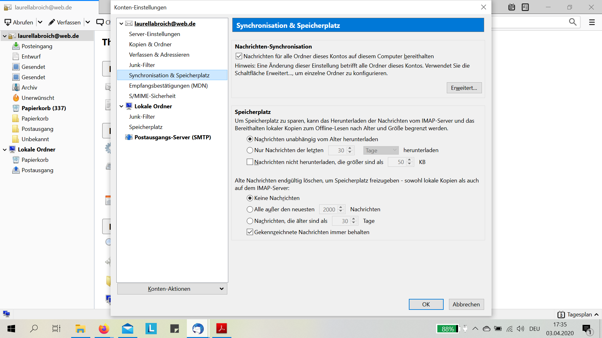Guten Tag, nachdem ich bereits in einigen Foren nach einer Lösung gesucht habe, bin ich immer noch nicht weiter. Thunderbird löscht nach 2-3 Wochen Emails im Posteingang. Bei meinem alten Laptop war das nie der Fall. Ich hab bei web.de keine Einstellung verändert und überprüft, dass überall "nie löschen" angegeben ist. Bei Thunderbird habe ich auch überprüft, dass "nie löschen" eingestellt ist. Anbei ein Screenshot. Ich verstehe einfach nicht, wo das Problem liegen könnte. Kann mir da jemand helfen?