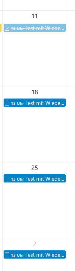 Wenn ich eine Aufgabe zum ersten Termin als erledigt markiere, wird eine neue Aufgabe zum nächsten fälligen Termin erzeugt. Damit kann ich gut leben.