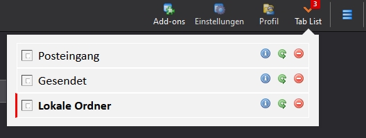 In dieser Liste existieren leider keine Xe zum Schließen der einzelnen Nachrichten. Kann man dieses X nachrüsten bzw. gibt es ein AddOn zur senkrechten Auflistung der geöffneten Nachrichten? Ich denke da z.B. an ein AddOn analog zu "Tab List Button Enhanced" oder "Tab Center Reborn".