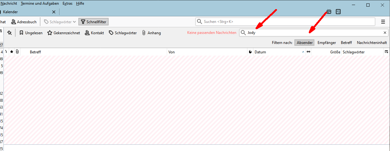ich setzt den Schnellfilter im Posteingang auf den Absender Jody - keine Ergebnisse.
