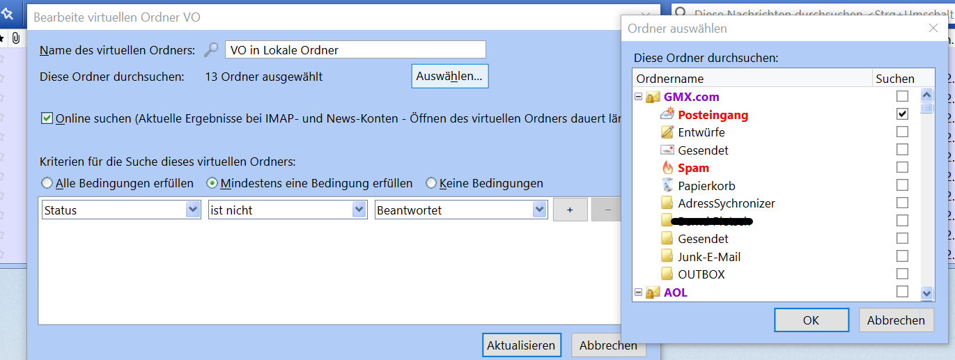 kannst du mir den Zweck nennen für den du Virtuelle Ordner brauchst? Oder besser du beschreibst uns die Filterbedingungen des VO oder machst davon einen Screenshot.