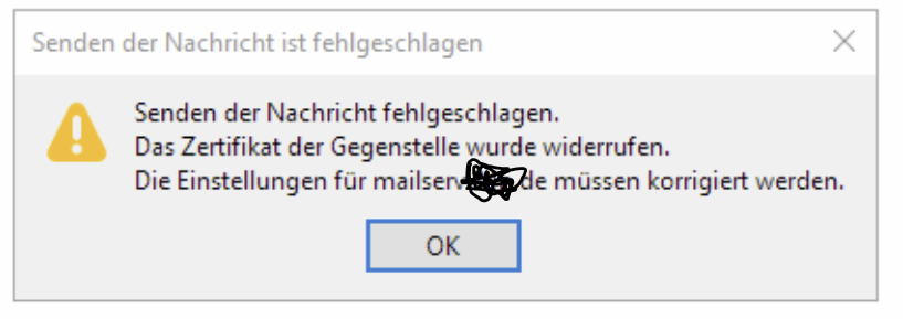 ich bin aktuell etwas ratlos. Ich kann aktuell keine E-Mails im Thunderbird verschicken. Ich erhalte die folgende Fehlermeldung: "Senden der Nachricht fehlgeschlagen. Das Zertifikat der Gegenstelle wueder wiederrufen. Die Einstellungen für mailserv.xyz.de müssen korrigiert werden".