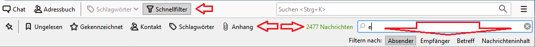 Konkret: Was ich zur suche tue ist, ist in dem suchfeld (search ctrl+k) einen teil der mail-domäne einzugeben, doch das ergebnis kommt nur zeitweise in der von mir gewünschten vollständigen form. Dieses fänomen genau beschreiben zu wollen würde einen grösseren untersuchungsaufwand erfordern. Ich vermute, die sucheinstellungen sind irgendwie nicht richtig, und wer die lage kennt, kann vielleicht auch aus dieser vagen beschreibung unmittelbar ablesen, was verkehrt sein müsste - und wie es zu lösen wäre?
