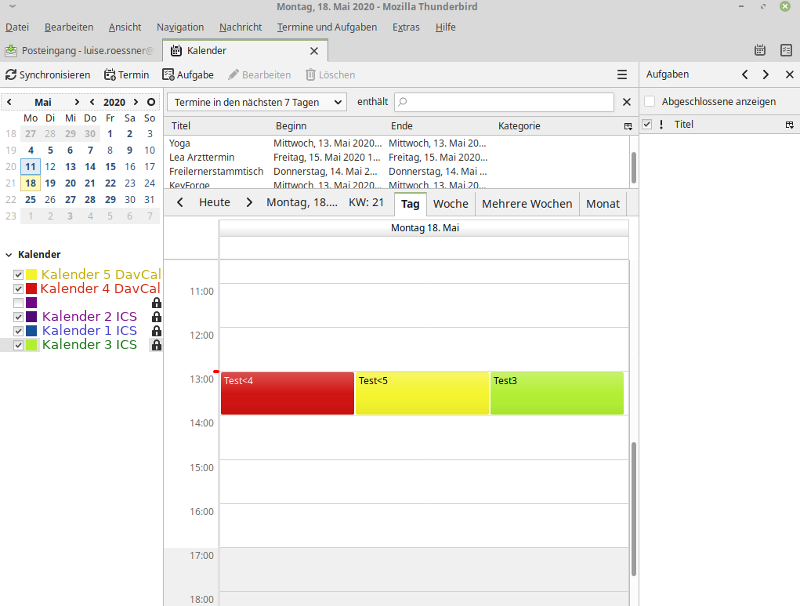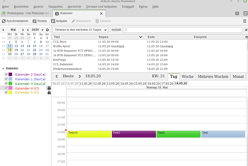 In meinem TB sehe ich meine 3 eigenen DAV-Kalender (1 blau, 2 violett, 3 grün) und einen ICS-Kalender (5 gelb). Mir fehlt also der Kalender 4 (rot).