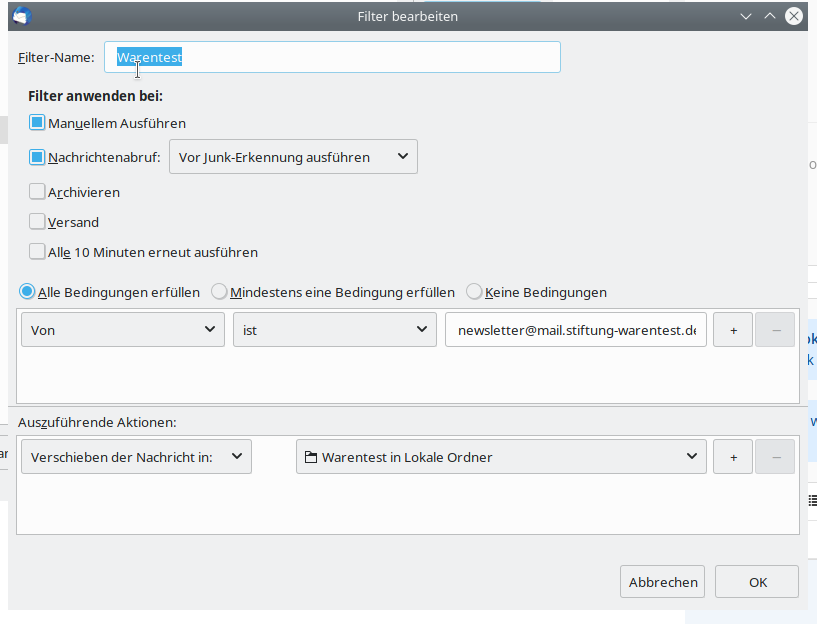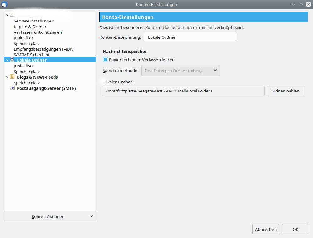Ich arbeite unter Linux und habe gerade die lokalen TB-Mail-Ordner auf ein NAS mit SSD verlagert (sind ca. 20 GByte, viele Mail-Anhänge dabei). Ich arbeite mit POP3. Es sind ein paar Filter aktiv, die eingehende Mails direkt bei Empfang in die lokalen Ordner einsortieren. Seit der Verlagerung aufs NAS werden die gefilterten Mails in den Zielordnern doppelt angezeigt. Woran liegt das / was kann ich dagegen tun? "Ordner reparieren" löscht die Duplikate in der Anzeige, aber es ist lästig, das immer für mehrere Ordner durchzuführen.