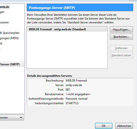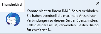 Hallo, benutze den TB schon sehr lange, hat immer funktioniert, jetzt musste ich Win neu aufspielen (Win7 32bit) , neueste TB-vers. drauf , Konteneinst. auf imap, passwwort etc. , nichts geht, auf erweiterte einstell. und mit ports probiert, auf die web.de seite und nachgelesen welche ports etc. alles richtig, trotzdem tb hohlt nichts ab. habe ein wenig pc-kenntnisse, aber jetzt verzweifel ich fast. alles öfter durchgespielt. Ports und Authentifizierungsmethode sind korrekt. Weiss jemand woran es liegt ?