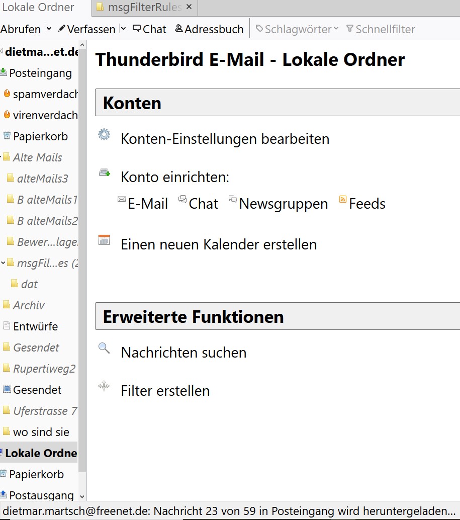 Guten Morgen, schlechter Tag heute! Bis jetzt hat mir leider noch niemand geholfen. Viele Archiv Ordner fehlen, mein Adressbuch ist leer. Meine Mail Ordner wurden von "fremder Hand" benannt und sortiert. Einen Papierkorb um gelöschte Mails wieder zu aktivieren fehlt auch? Geht es nicht einfach so, das ich meine letzte Version wieder zurück bekomme? Bitte hilft mir einer? Ich bin bestimmt in letzter Zeit nicht der Einzige, wem das passiert ist? Gruß Dietmar erster Anhang: meine Mailoberfläche wie sie nicht von mir eingerichtet wurde; mein Stand an update, ich hatte seither nicht viel an meinen Mails gemacht, es lief immer gut, so möchte ich es wieder haben, sonst muß ich mich verabschieden.