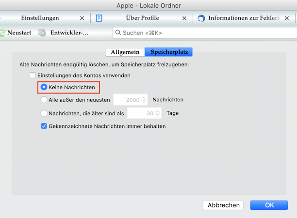 Hier ein Beispiel für meinen Ordner Apple in den Lokalen ORdnern, für den ich "Keine Nachrichten" (löschen) gewählt habe