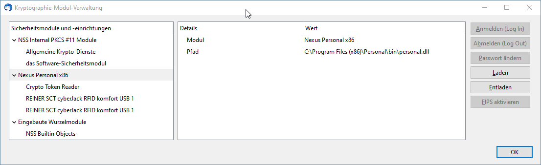 Als Middleware (CSP) setze ich Nexus Personal (V. 5.2.1) ein, diese ist auch in Form der personal.dll (ebenfalls 32-bit) in der Kryptographie-Modul-Verwaltung eingerichtet: