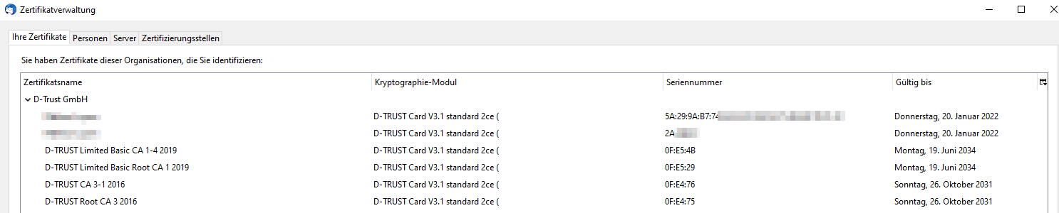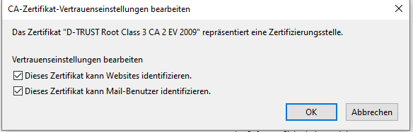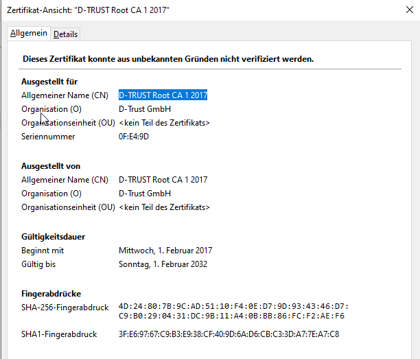 Allen D-Trust-Zwischenzertifizierungsstellen wird vertraut.. exemplarisch hier der Screenshot des 1. Zertifikats: