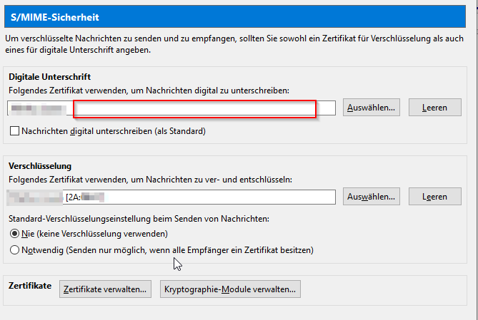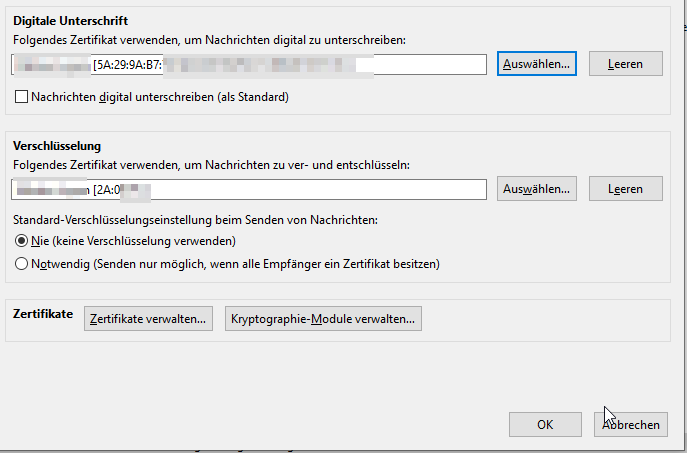 In der Zertifikatsverwaltung sind meine Zertifikate enthalten Signatur & Verschlüsselungszertifikat