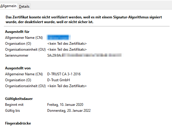 stellt man fest, die Seriennummer des Zertifikatsfehlt.
