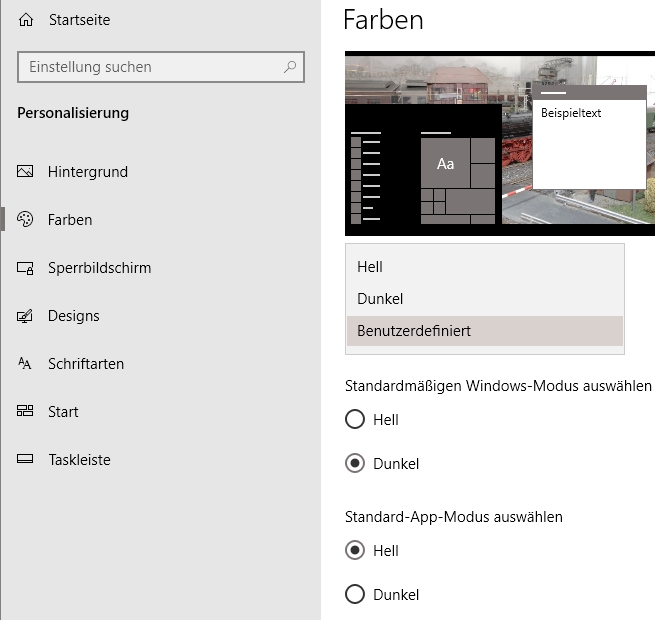 - Unter Windows 10 habe ich das sogenannte "Dark Theme" aktiviert (für Windows und für alle Apps)