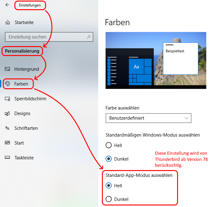 Das Ganze ist aber in Thunderbird 78 momentan noch sehr fehlerbehaftet (falls Du es überhaupt benutzt), da die Themes innerhalb von Thunderbird noch nicht richtig auf die notwendigen Dinge zugreifen können. Das wird gerade noch verbessert und ich vermute, dass es ab Thunderbird 78.2 dann korrekt funktionieren könnte. In Thunderbird wird es momentan eigentlich nur vom Standard-Theme weitgehend korrekt dargestellt. Aber auch da gibt es noch Ungereimtheiten, wenn man im System für den App-Modus auf "Dunkel" geschaltet hat.