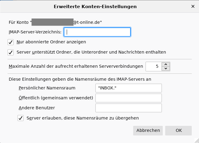 Jedes IMAP-Konto in den Profilen wurde gemäß den vom Thunderbird vorgeschlagenen Standardeinstellungen ( bzw. gegebenenfalls vom Kontenanbieter geforderten besonderen Einstellungen) manuell eingerichtet und bei [Konten-Einstellungen]-[IMAP-Kontoname]-[Server-Einstellungen]-[Erweiterte Konten-Einstellungen] wurden meinerseits keine Extrawürste gebraten, will heißen, dort wurde nicht verändert. Bildschirmausdruck eines T-Online-Kontos: