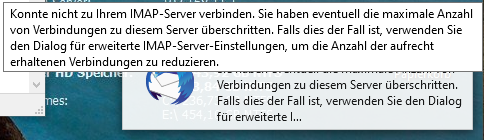 Der betroffene IMAP-Server wird nicht benannt, was die Fehlermeldung obsolet macht, wenn man mehr als ein IMAP-Konto am Laufen hat. Bei mir sind es mehr als zehn! Manche davon werden noch (aus historischen Gründen: meine Anfänge waren noch mit POP3) parallel als POP3 geführt.