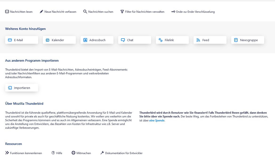 Die Seite, die seit der neuen TB Version angezeigt wird, wenn man in der linken Spalte nicht auf einen Ordner klickt, sondern auf das übergeordnete Konto, enthält für mein Umfeld zu viele Aktivitäten, zu denen der Nutzer aufgefordert wird (neues Konto anlegen, Filelink, Chat, Feed, Importieren..).