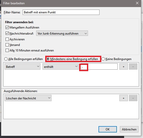 Weil ich z.Zt. ziemlich viele Spam-Mails erhalte, deren Betreff mit einem Punkt anfängt und weil das bei all meinen anderen Mails nicht der Fall ist, wollte ich die fraglichen Mails mit der Filter-Bedingung "Betreff beginnt mit ." herausfiltern. Das ist mir bis jetzt nicht geglückt - wahrscheinlich, weil Punkt als Metazeichen interpretiert wird. Kann mir bitte jemand einen Tipp geben, wie ich das (vermutete) Metazeichen in ein echtes Zeichen umwandeln kann?