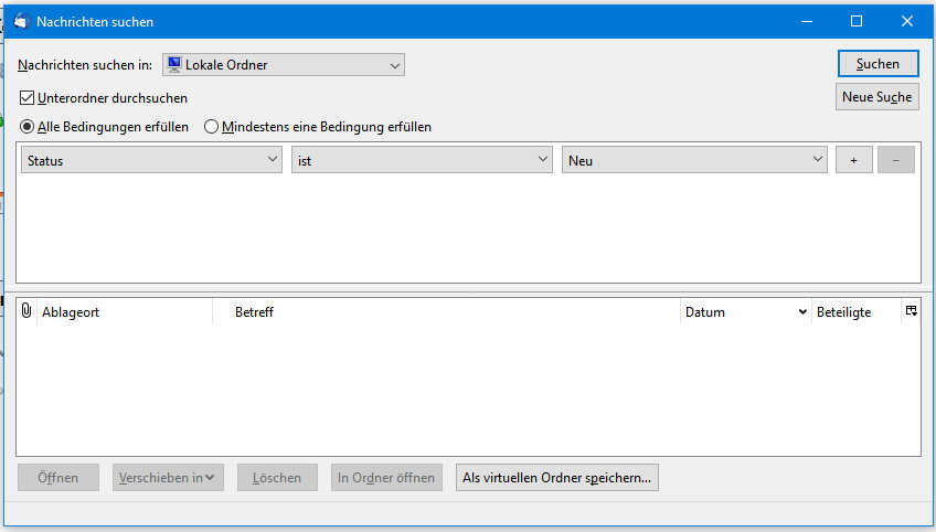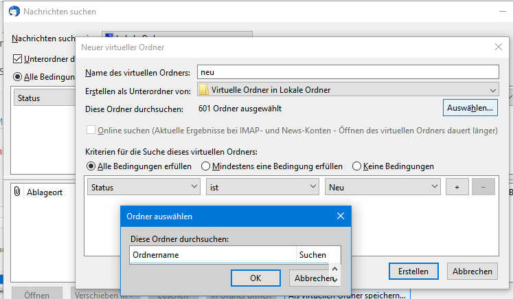 Das ging bis vor geschätzt ungefähr einem halben Jahr problemlos. Ich habe „Lokale Ordner“ markiert, dann mit Rechtsklick „Nachrichten suchen“ aufgerufen und konnte dort „Als virtuellen Ordner speichern ...“ auswählen. Dann wurde ich natürlich nach dem Speicherort gefragt und es gab die Möglichkeit, die Auswahl der zu durchsuchenden Ordnern zu verändern oder zu ergänzen. Ich konnte dort ohne weiteres zum Beispiel auch die Posteingangskonten meiner diversen E-Mail-Adressen hinzufügen. Das scheint aber jetzt nicht mehr zu funktionieren.