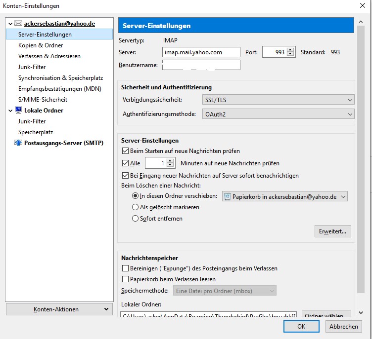 Porteinstellungen sind überprüft, alle korrekt. Yahoo! Mail 2 Faktor Authentifizierung aktiviert mit App-Passwort für Thunderbird, welches es allerdings nicht nimmt, da Websiteanmeldung. Auch ohne 2 Faktor probiert, ohne Erfolg.