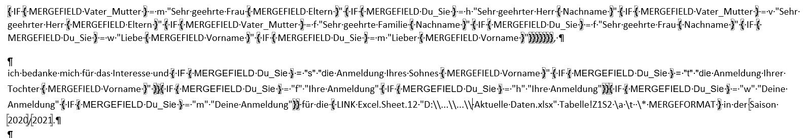Ich habe ein Word-Dokument als Serienbrief angelegt, das außer den Verweisen auf die zugehörige Excel-Datei mit üblichen Spaltenüberschriften wie Nachname / Vorname / Adresse und den Mail-Adressen noch Links auf eine weitere Excel-Datei enthält, die über verschachtelte "IF"-Bedingungen die Anreden sowie Inhalte des Schreibens steuert. Nur die Serienbrieffelder zu verwenden, geht also nicht. Zudem sind Textmarken definiert, die über Querverweise im Dokument verlinkt sind.