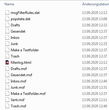 Auf Dateiebene im Profil (Mail) fällt auf, dass dort – solange ich mit dem händisch ausgewählten Ordner arbeite – die Dateien Gesendet, Gedendet.msf und Gesendet.snm existieren, nicht aber die mit der englischen Bezeichnung Sent. Wenn ich dagegen den Standardordner wähle, legt TB im Profil eine Datei Sent.msf an (nicht aber die beiden anderen) und es kommt wieder zur o.g. Fehlermeldung.