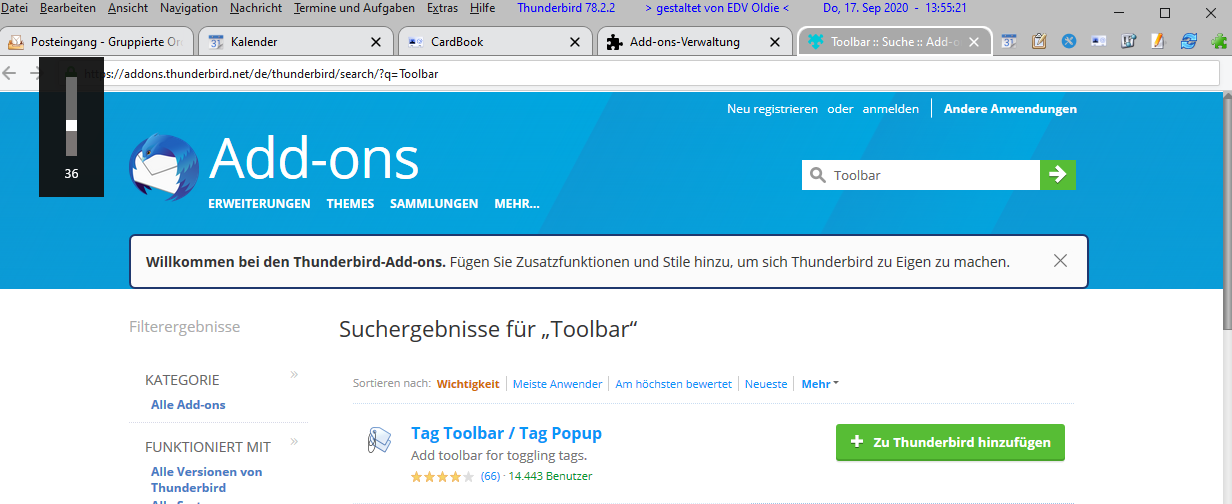Erweiterungen lassen sich bei mir nur noch aus einer Datei installieren. Suche ich etwas im Suchfeld Weitere Add-ons finden so öffnet sich ein neuer Tab mit der AddOn-Seite von Mozilla und ich habe die Möglichkeit die Erweiterungen herunter zu laden. Ich zweifel gerade sowieso an mir (siehe mein vorheriger Post bzgl. AllowHTMLtemp), aber ich bin mir sicher, dass ich bei der Umstellung auf TB78 inkl. eines neuen Profils die Erweiterungen direkt in TB installieren konnte. Was habe ich Trottel verstellt und wie bekomme ich das wieder richtig hin?