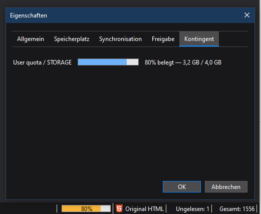 Aus früheren Versionen (bis 68) kannte ich diese Anzeige, welche bei einer Belegung von 80 % erschien. Für eine ständige Anzeige gab es dann das Add-on "IMAP Quota", welches jetzt bei TB 78 nicht mehr kompatibel ist.