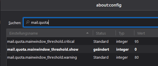 Da seit Thunderbird 78 alle Arten von Quotas / Kontingenten für die Anzeige unterstützt werden, führt dies scheinbar vor allem bei T-Online-Postfächern (die positiver Weise die verschiedenen Quotas auch mitteilen) dazu, dass gefühlt zu Unrecht eine Quota-Warnung in der Statusleiste angezeigt wird, wenn man beispielsweise die maximalen 3 Ebenen der Ordner-Hierarchie verwendet aber vielleicht fast keine Mails im Postfach hat. Die Quota-Warnung ist dann einerseits irgendwie "richtig", andererseits aber auch unnütz, da die Anzeige damit kaum noch brauchbar ist, wie ich finde.