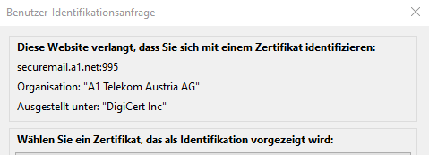 Seit ca. 1 Jahr kommt beim starten von Thunderbird eine Fehlermeldung das es ein Zertifikat von A1 braucht und man soll eines auswählen.