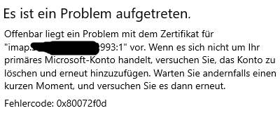 Bei der Verknüpfung dieser Roundcube E-Mail mit der Windows 10 Mail App kommt folgender Fehler: