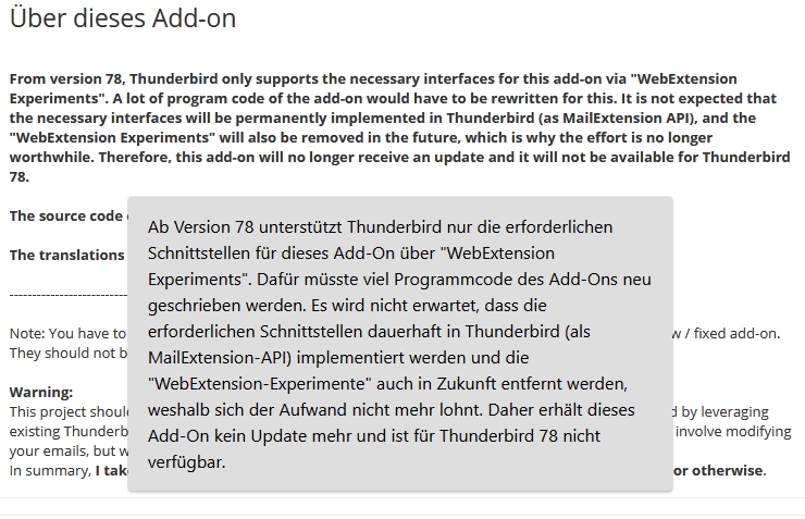 Schade Thunderbird hat damit einen großen Teil seiner Attraktivität verloren. Ich fürchte auch das durch den allgemeinen Kostendruck auf Grund der Situation in Deutschland kaum ein Entwickler an die Anpassung seiner Erweiterung denkt.