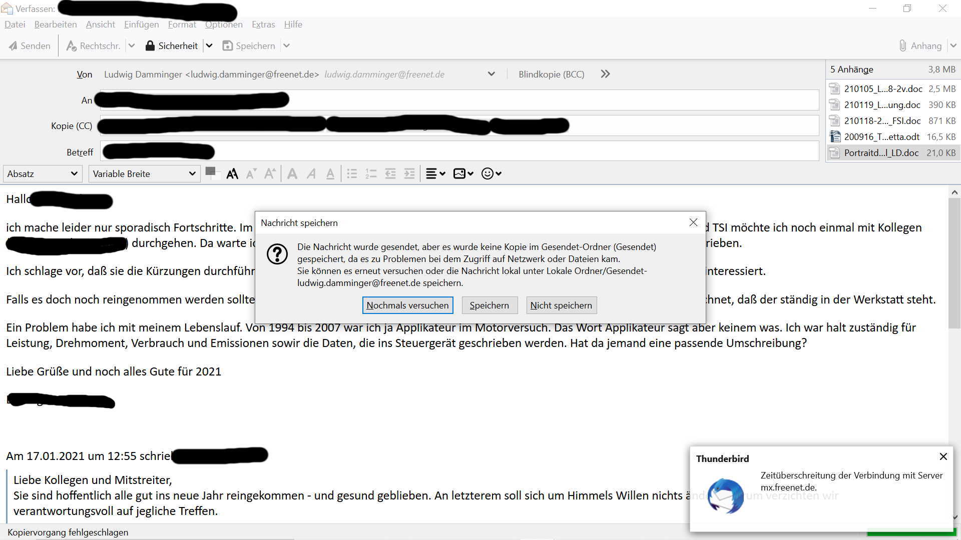 seit dem Wochenende werden Mails mit Anhang(Dokumente, Bilder) nicht mehr gesendet und auch nicht in ,Entwürfe' gespeichert. Als Grund wird Zeitüberschreitung beim Verbinden mit dem Server angegeben.