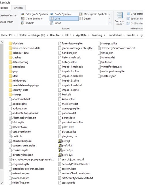 Danke; ich navigiere zum Ordner Appdata/thunderbird/profiles. Es erscheint ein einziger neuer Ordnuner mit dem Namen: sy7kfyr1.default.