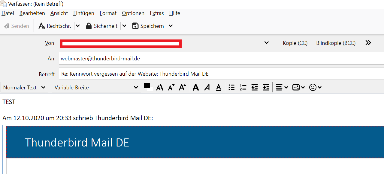 Sobald TB geöffnet ist, zeigt er die Buchstaben im Adressfeld rot an. Das Senden-Icon bleibt eingegraut.