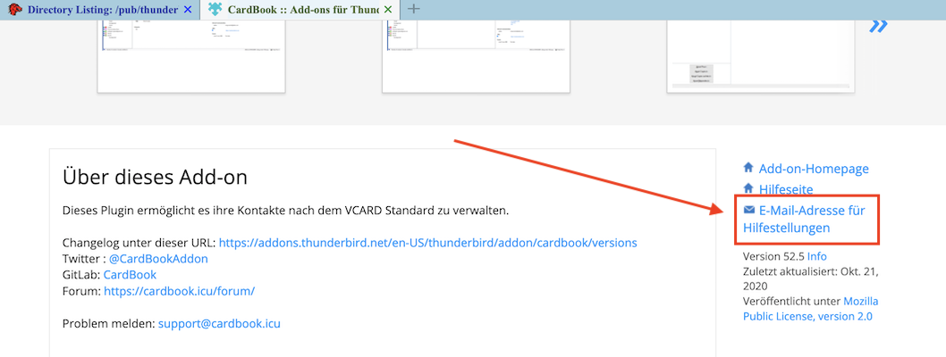 Warst du schon auf der Add-on-Seite von CardBook https://addons.thunderbird.net/de/thunderbird/addon/cardbook/ und hast auf den Link "E-Mailadresse für Hilfestellungen" geklickt?