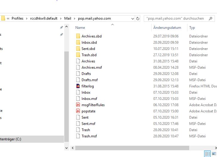 • den Ordner pop.mail.yahoo.de öffnen, die Dateien Inbox und Sent sowie die Ordner Inbox.sbd und Sent.sbd in den Ordner pop.mail.yahoo-1.de kopieren bzw. verschieben. Die *.msf Dateien unbeachtet lassen