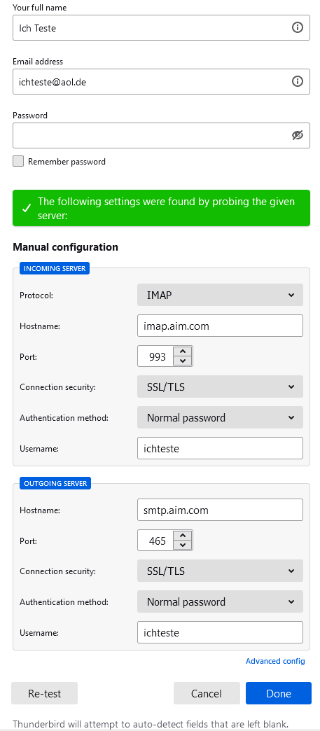 Mein 84jähriger Vater hat jedoch eine aol.de-Mailadresse. Hier wird man im Rahmen der notwendigen Umstellung aif OAuth2 zu Yahoo weitergeleitet. Da man dort die Mailadresse nicht kannte, habe ich einen Yahoo-Account mit der aol.de-Adresse angelegt. Wenn man sich im Browser bei Yahoo einloggt, kann man nun dort sein AOL-E-Mails abrufen. Bei Thunderbird sieht es jedoch so aus: Thunderbird erkennt die Servereinstellungen, dann erfolgt die Weiterleitung zu Yahoo. Dort wird dann nach dem Einloggen gefragt, ob man Thunderbird den Zugriff erlauben will. Nach dem Bejahen legt Thunderbird das Konto an. Aber es werden keine Mails angezeigt. Thunderbird nutzt die Server-Einstellungen von Yahoo. Das sich um eine aol.de-Adresse handelt, habe ich probeweise die AOL-Servereinstellungen eingeben und diverse Ports. Ergebnis: auch wenn es eine Verbindung zum Server gibt (AOL bestätigt per Mail, dass der Zugriff erfolgt ist) werden keine Mails angezeigt. Wer kann mir weiterhelfen? Danke!