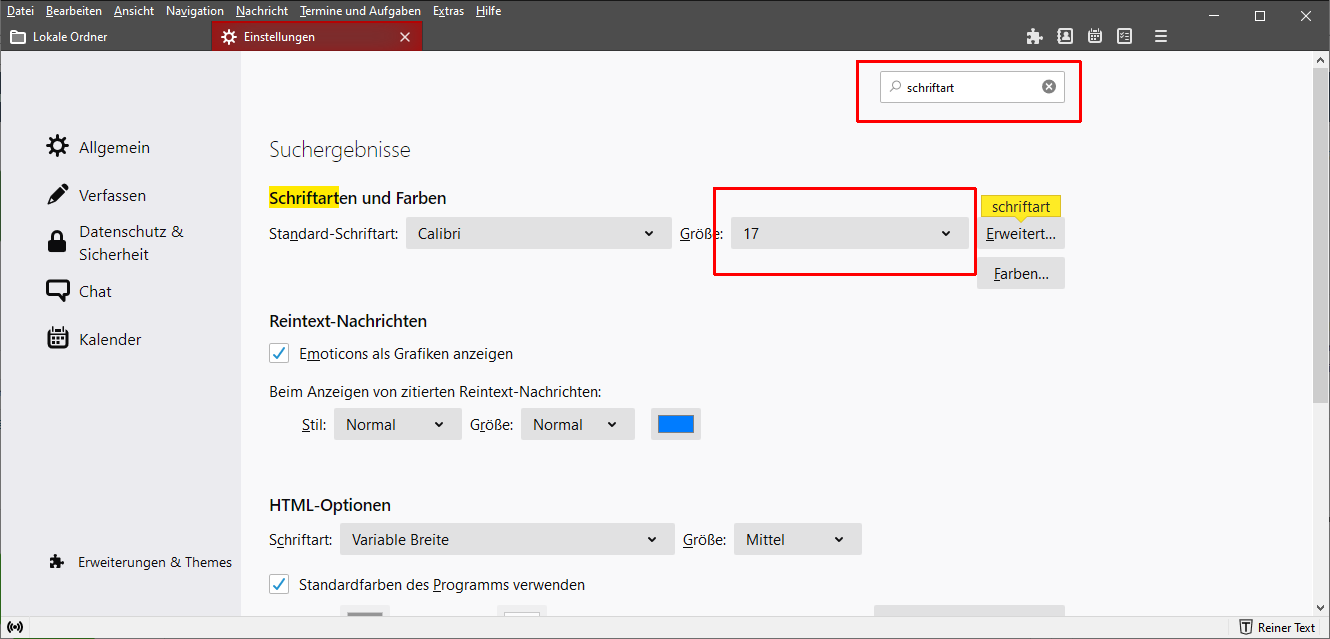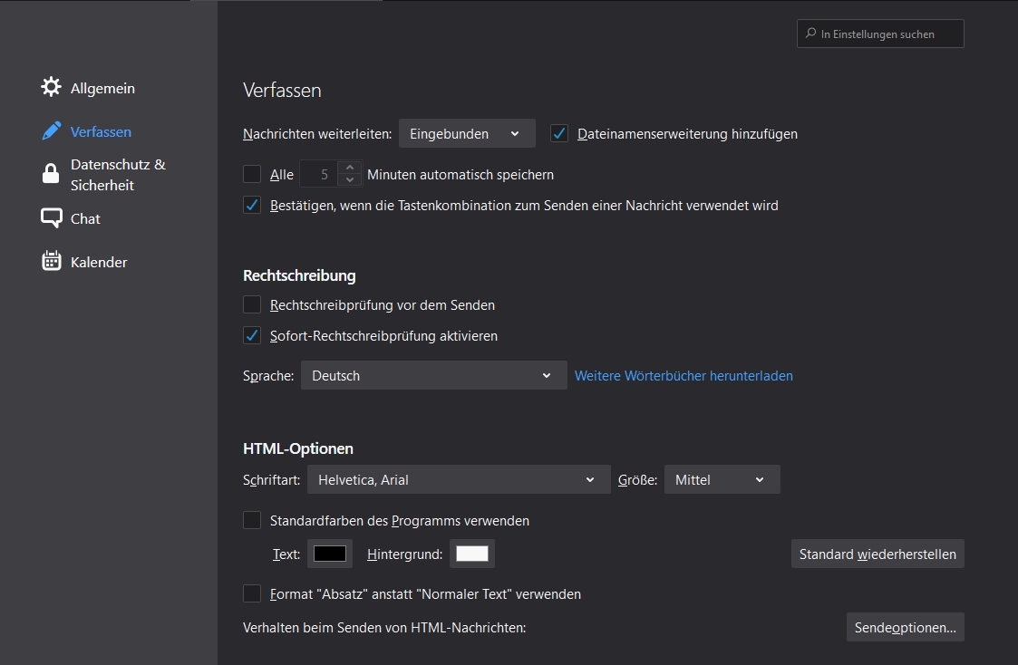 ich finde die Möglichkeit nicht mehr, in der ich die Schriftart (font) und Zeichengröße für meine ausgehenden Mails aller Konten einstellen kann.