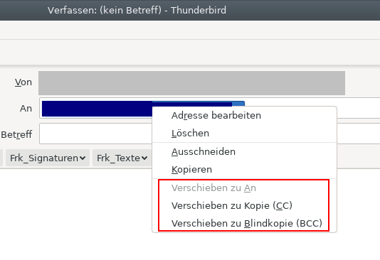 Guten Tag, ich bin völlig entgeistert: Seit vielen Jahren (eigentlich, solange ich zurückdenken kann bzw. TB benutze) hatte ich immer mehrere Adresszeilen, die ich via Drop-Down-Liste auch nachträglich noch als An, CC oder BCC umdefinieren konnte. Wenn die vorhandenen Adresszeilen "alle" waren, dann entstand nach jedem ENTER automatisch eine weitere. Dafür habe ich zu keinem Zeitpunkt irgendetwas programmiert, nicht einmal ein Add-On installiert - das war einfach so. (Ich betone das, weil das in einer Antwort auf eine verwandte Frage Mail verfassen dauerhafte Einblendung von CC und BCC bestritten wird.)