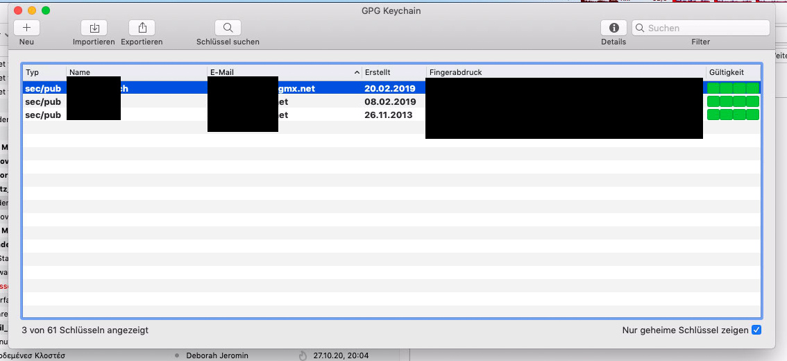 Sie hat auch noch ein Notebook mit einer älteren Version von Thunderbird, Enigmail und Mac OS High Sierra. Dort kann ich alle Keys exportieren, auf dem Festrechner die Keys importieren - immernoch werden keine Nachrichten entschlüsselt.