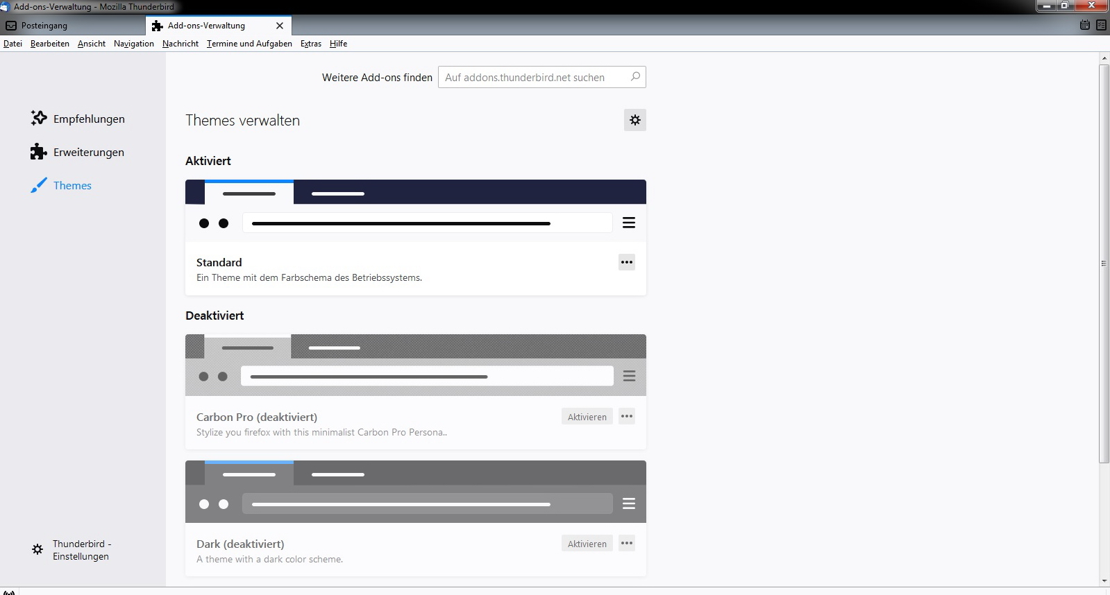 Zwischenzeitlich habe ich bei den Themes "Carbon Pro" gefunden. Eigentlich sehr gut, aber der dunkle Hintergrund bei der E-Mail-Vorschau und bei Verfassen einer E-Mail stört mich sehr. Er sollte genau so weiss sein, wie der Rest: