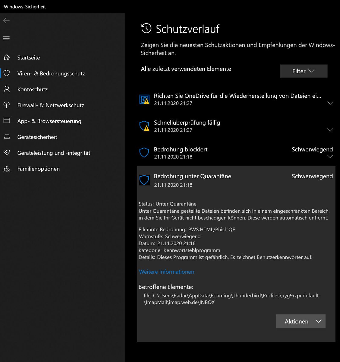 Direkt nach dem Update auf 78.5.0 schlägt Windows Defender Alarm: gefunden wurde eine schwerwiegende Bedrohung namens PWS:HTML/Phish.QF, ein Kennwortstehlprogramm. Laut Microsoft ist das Programm gefährlich und zeichnet Benutzerkennwörter auf. Die betroffene Datei bzw. das betroffene Element (wie Microsoft es nennt) ist scheinbar die Inbox eines meiner Emailkonten: file: C:\Users\Name\AppData\Roaming\Thunderbird\Profiles\uyg9rzpr.default\ImapMail\imap.web.de\INBOX.