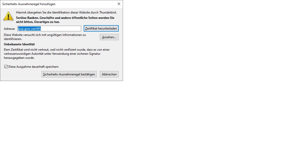 Ansehen kann ich mir das Zertifikat, aber bei Ausnahme dauerhaft speichern kommt es immer wieder.