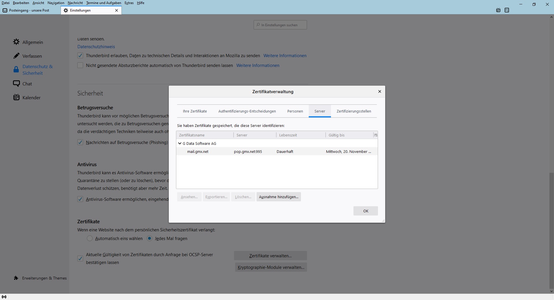 bei dem Reiter Server ist unter G DATA genau dieses Zertifikat hinterlegt.